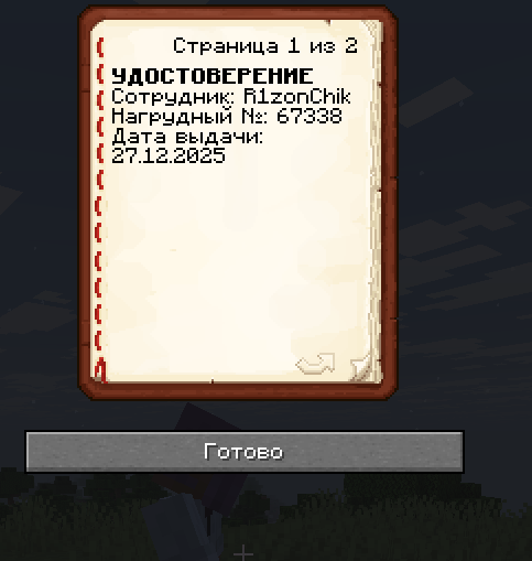 | • /id <ник> — показать СВОЁ удостоверение игроку • Двойной SHIFT — быстрый показ (смотря на цель) • Проверка дистанции (7 блоков) • Кулдаун 15 секунд • Требование предмета в инвентаре | • %refontsearch_player_name% • %refontsearch_badge_number% • %refontsearch_badge_date% • Настраиваемый текст книги • Поддержка кастомных моделей |