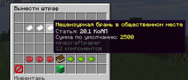 | • Выбор причины из списка • Регулировка суммы кнопками (+100/+500/+1000) • Подтверждение одним кликом • Лимиты и кулдауны | • Оплата через /fines • Интеграция с Vault Economy • Лимит активных штрафов • История выплат | • Срок оплаты (по умолчанию 7 дней) • Автоматическая пеня (множитель или надбавка) • Максимальный капп пени |