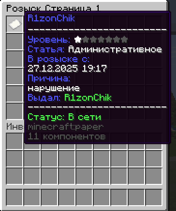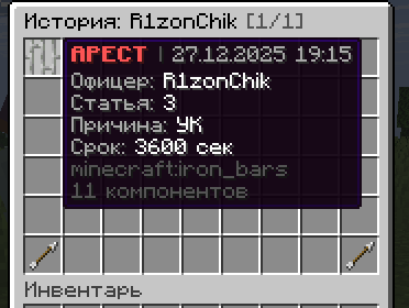 - PlaceholderAPI — 30+ плейсхолдеров статуса (розыск, штрафы, залог, дежурство)